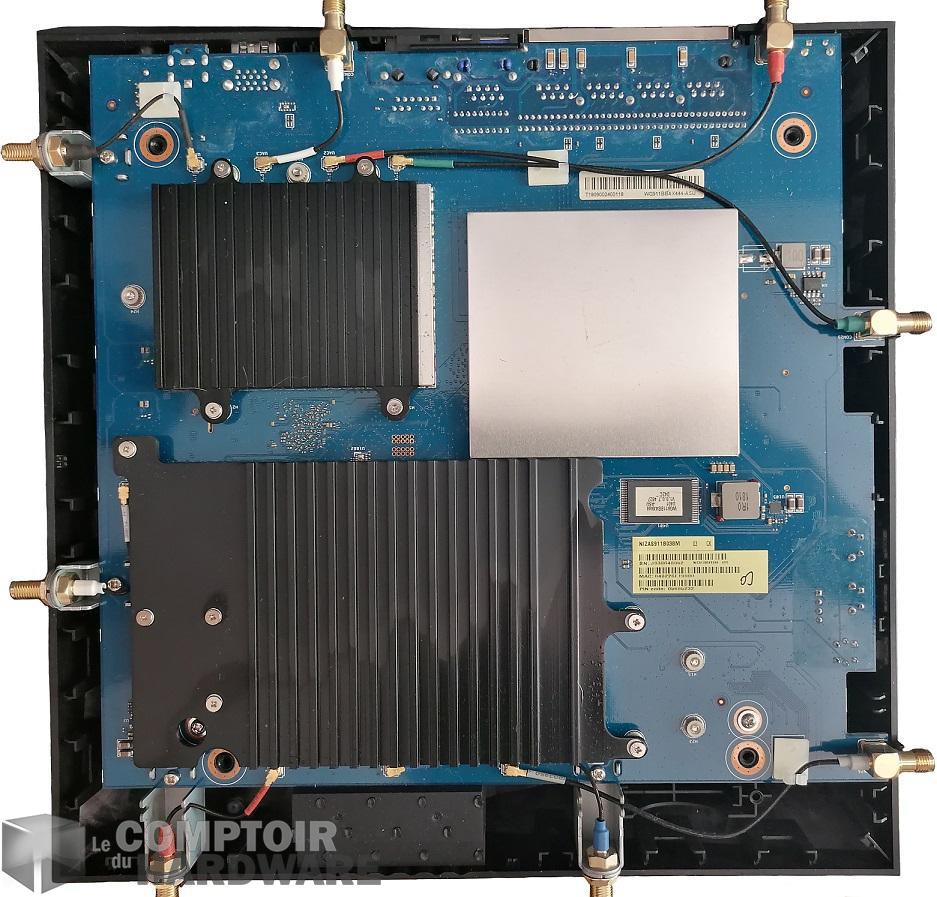 Nous avons pu décortiquer la bête, voici ses entrailles et vous pouvez donc avoir un aperçu de comment est constitué ce monstre ASUS. On pourra pester sur la taille des dissipateurs, il restait quand même bien assez d'espace pour permettre d'augmenter la taille des ailettes - épaisses il faut dire. Le transfert thermique se fait via des pads présents entre les plaques en aluminium et les puces, puis de ces mêmes plaques vers les radiateurs. Il est forcément possible d'optimiser un peu plus tout ça, mais nous sommes sur un routeur après tout et pour le coup, la solution embarquée a l'air de faire clairement son job.