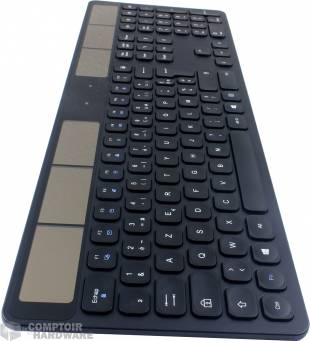 Dans son petit carton fin, calé avec du carton et emballé dans du plastique, on y trouve le clavier... et c'est tout. Assez logiquement, pas de câble à l'horizon ni de manuel pour expliquer son principe et fonctionnement. En fait, les instructions ont simplement été imprimées au dos du carton et il n'y en a d'ailleurs que deux : brancher le dongle et basculer l'interrupteur sur « ON », facile ! De face, le clavier ne paye pas de mine, c'est un clavier de bureau basique très fin avec des capuchons plats low profile, à la manière d'un clavier de PC portable et auquel a été intégrée une poignée de capteurs « solaires » et de batteries pour son alimentation. C'est d'ailleurs cette partie-là qui attirera l’œil en premier, surtout si vous n'avez jamais eu un clavier de la sorte entre les mains. On dénombre deux zones distinctes de capteurs (sûrement une pour chaque batterie), séparées par les deux seuls indicateurs (vaguement) lumineux du clavier situés au centre. Attention, il faut penser à enlever le film plastique recouvrant cette partie, sans quoi la charge solaire fonctionnera très mal (le service client le spécifie sur le site, probablement signe que la tendance est à l'oublier).