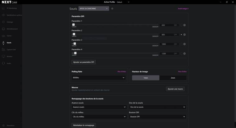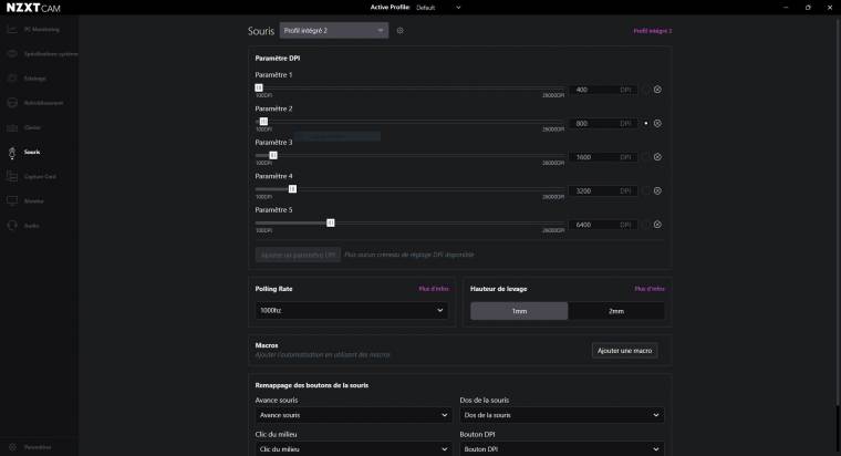 NZXT intègre ses souris à son environnement CAM. Nous ne ferons pas le tour des possibilité du logiciel, simplement de la partie concenant les souris. Ainsi vous aurez accès à tous les paramétrages sur une seule page. Par défaut, les modèles sont réglés sur des valeurs assez basses. 400 DPI, 1000Hz et une distance de levage de 1 mm.