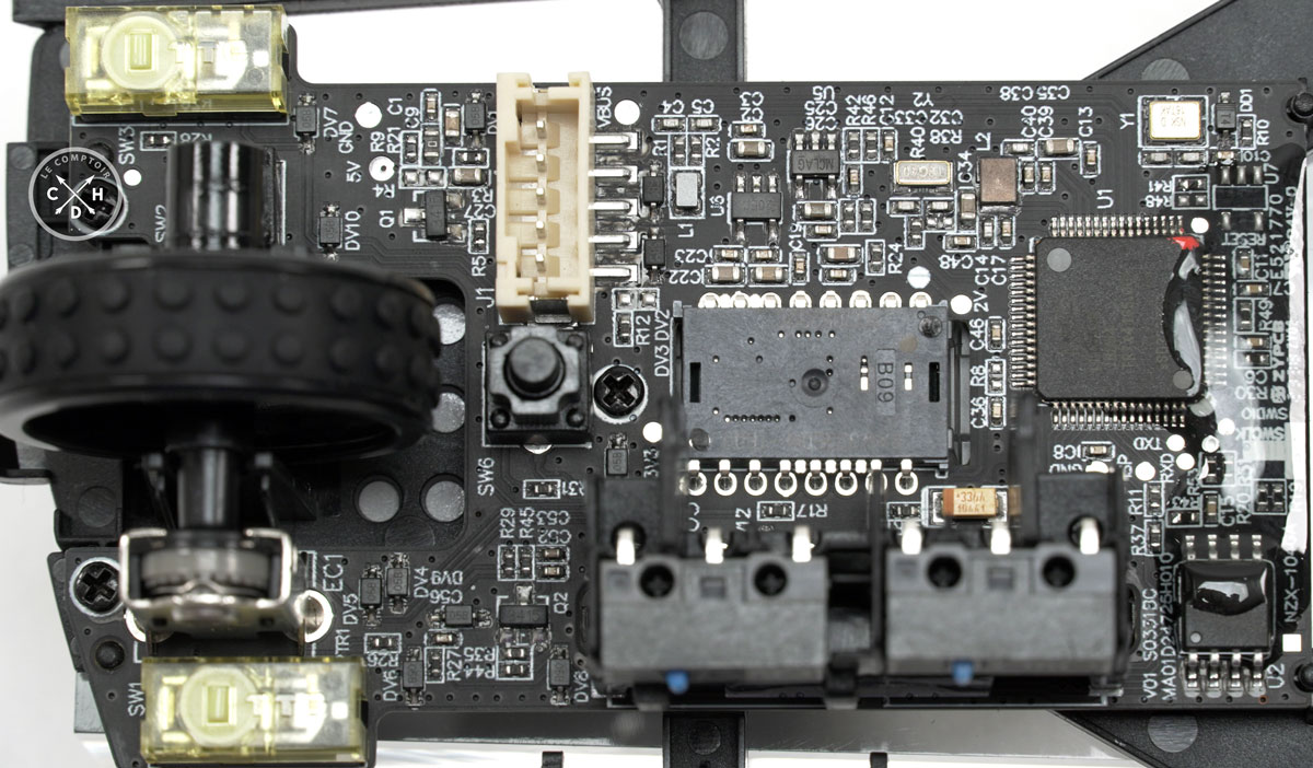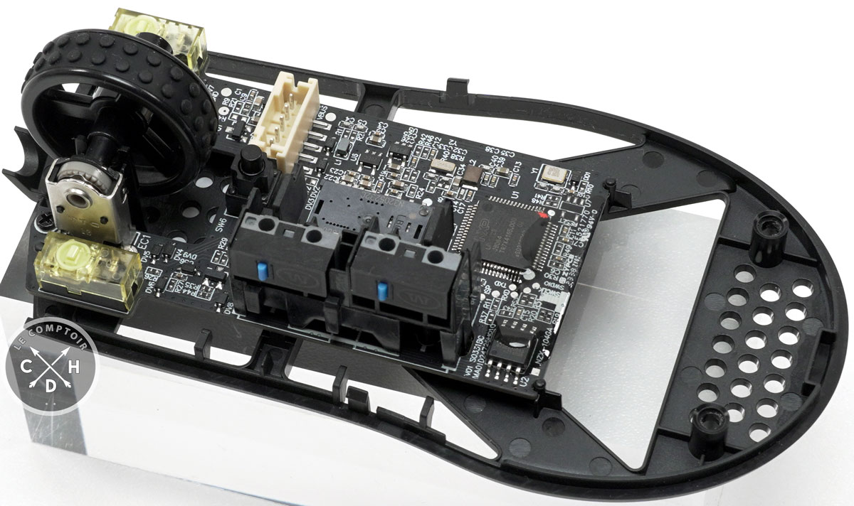 Sur le bout de PCB, vous trouverez le capteur PixArt PMW3395 dont les spécifications sont aberrantes : jusqu'à 26000 DPI, un taux d'interrogation allant de 125 à 8000Hz, un tracking de 650 DPI, une accélération de 50G ! Quant à la lentille utilisée, si elle provient du même fournisseur, il doit s'agir d'une LOAE-LSI1. Ce capteur n'est plus à présenter puisqu'il équipe bon nombre de modèles milieu de gamme (aux noms tous plus bizarres les uns que les autres) du marché. La référence de l'autre puce de contrôle est illisible; difficile en l'état de vous confirmer sa provenance.