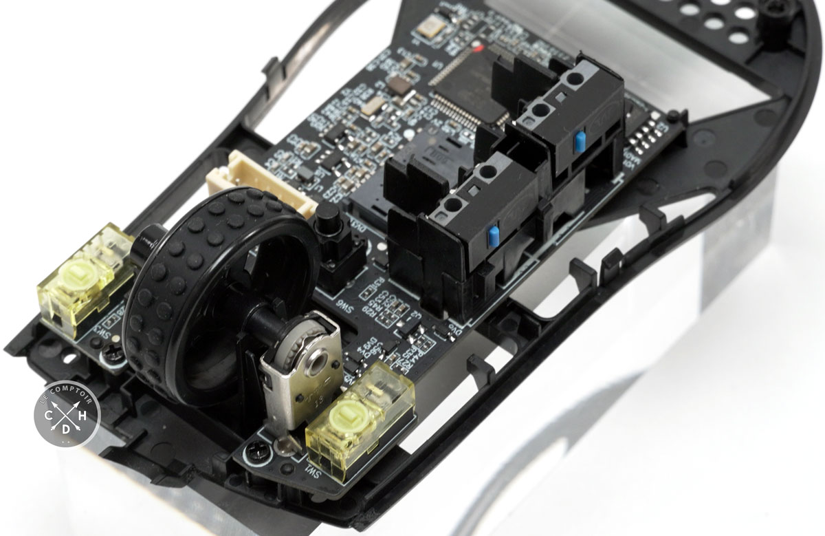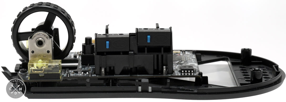Comme vous pouvez le voir, les souris sont équipées d'interrupteurs mécaniques. Il semble qu'Omron soit toujours le fournisseur; nous demandons confirmation. Contrairement à notre référence suisse, les clics ne produisent pas un son homogène. Les boutons droit et gauche, ainsi que le clic central de couleur jaune, feront un bruit légèrement grave. Les switches latéraux bleus seront pour leur part un peu plus clicky. Rien de gênant dans tout cela, mais si vous n'avez pas l'habitude des interrupteurs mécaniques, cela peut vous surprendre les premiers temps.