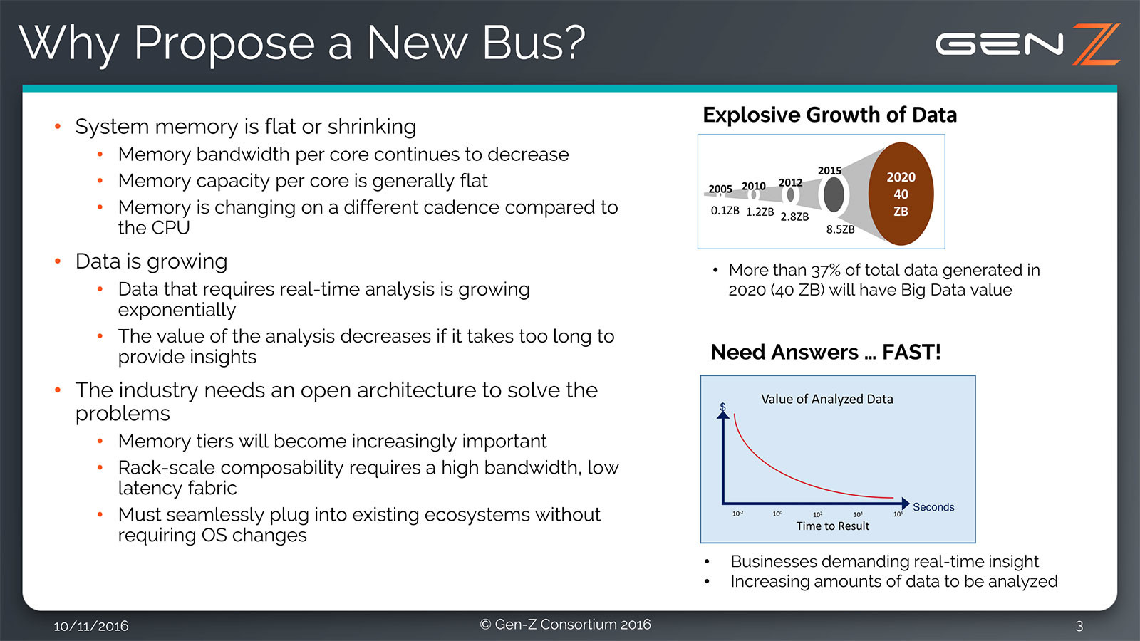 Cette "nouvelle" approche proposée par le Gen-Z Consortium pourra avoir un impact sur la machine de tata Suzanne (qui ne le verra pas), mais s'adresse surtout au monde professionnel et particulièrement aux centres de données (Data Centers). Chaque année, de plus en plus de données circulent sur la toile et ces dernières ont de la valeur (différentes firmes nous ont prouvé que tout ce qui circule peut se transformer en argent). Pouvoir faire circuler les données plus rapidement rime donc avec possibilité d'augmenter ses recettes et cette motivation pourrait servir à tous. Les industriels pourraient passer à une technologie plus adaptée à leurs besoins et les utilisateurs pourraient voir leur matériel évoluer, tout en ayant un accès facilité à leurs données distantes (sans prendre en compte la qualité de leur connexion à la toile, ce qui est un autre et vaste sujet).