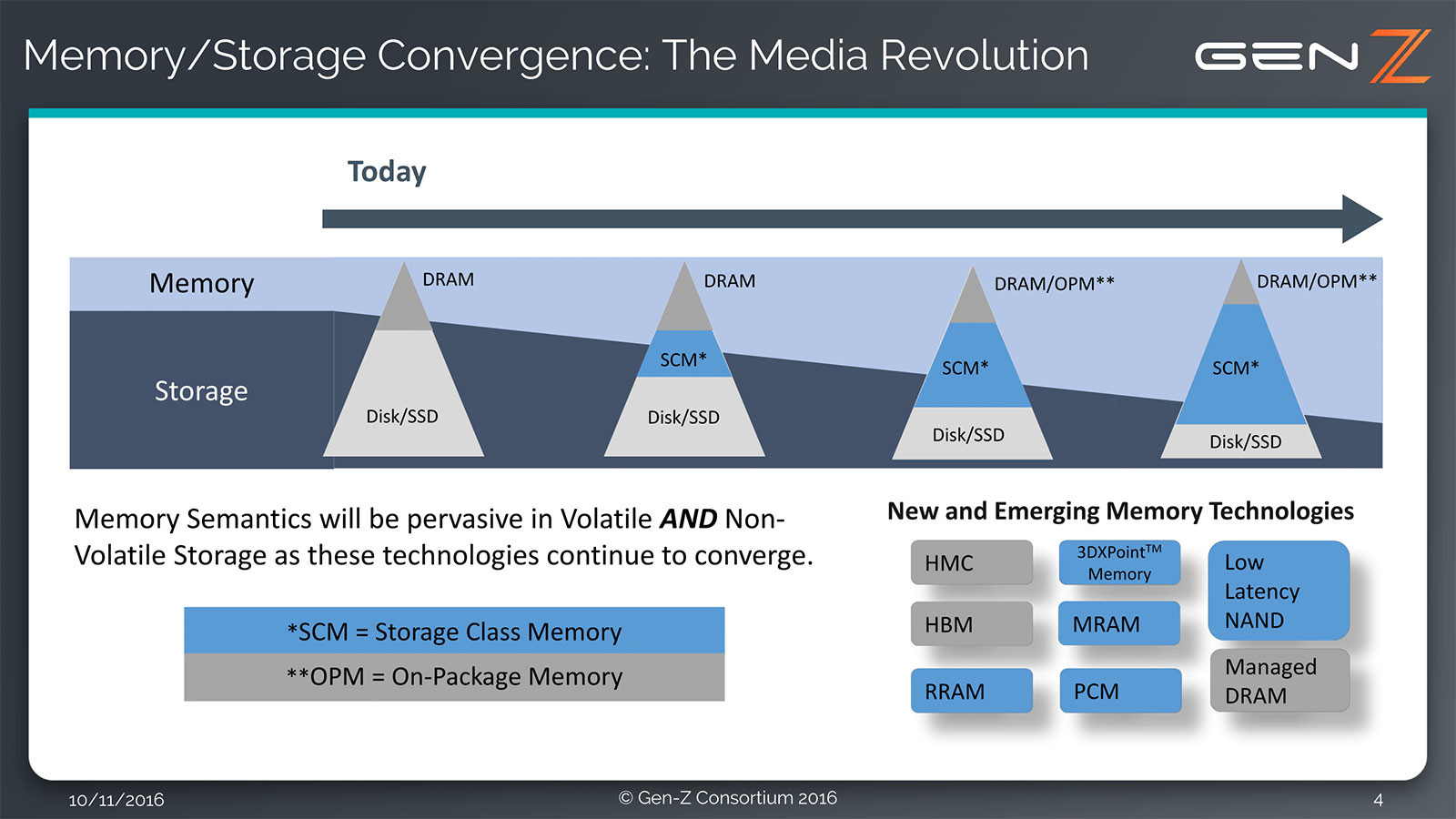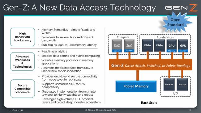 Un groupe de grosses boites du monde de l'informatique et des nouvelles technologies vient de créer le Gen-Z Consortium. Leur but est de créer un nouveau standard d'interface mémoire, ouvert aux technologies du futur et capable d'interconnecter les différents médias (RAM, VRAM, HDD, SSD...) pour améliorer les performances et rendre le tout plus accessible. C'est que les technologies actuelles ont toujours vu le stockage comme bien moins performant que la mémoire vive, mais les dernières technologies (NAND 3D, HBM...) ont montré que cela n'était plus vrai et des modèles de stockage à puce NAND sur slot DIMM se sont déjà montrés par le passé, comme le TerraDIMM de Diablo Technologies ou les essais de Dell et HP en la matière.