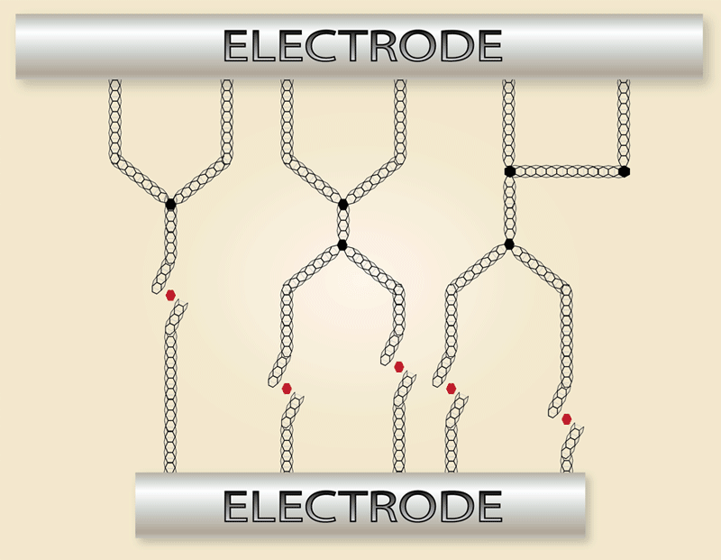 Au niveau d'une cellule, l'idée est d'utiliser les interaction de Van der Waals, c'est-à-dire une propriétés résultants de différentes interactions répulsive et attractives, stabilisant en théorie deux atomes à une distance fixe. Par le biais d'un champs imposé par deux électrodes, il est possible de basculer entre deux états stables : nanotubes attachés ou détachés. Tout cela est bien joli, mais il faut également que ces deux états soit consultables (en lecture) rapidement pour en faire de la RAM, ce qui est possible via de simples considérations électriques : si de nombreux nanotubes se touchent, la résistance de la cellule est faible et le bit représenté à 1. Dans le cas contraire, les tubes se comportent de manières isolante (Nantero communique sur un facteur 10 entre ces deux résistances, de quoi avoir de la marge d'erreur) : le bit est à 0.