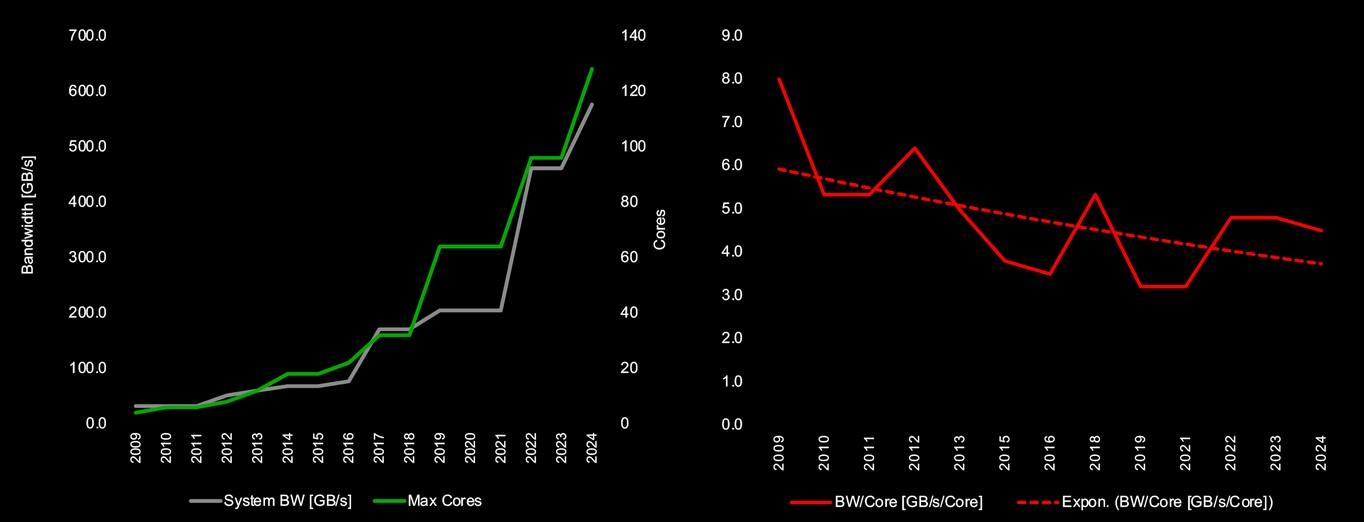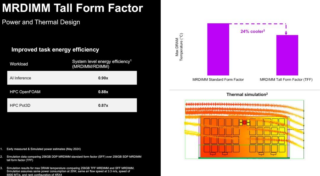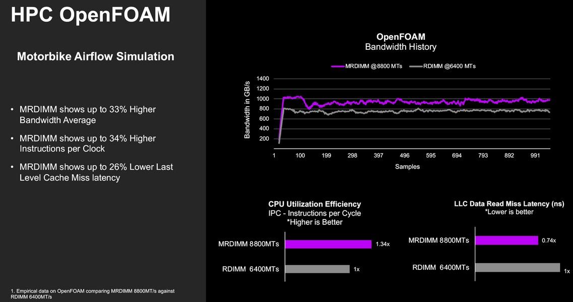 Intel explique que dans certaines charges de travail (modélisation météorologique, dynamique des fluides computationnelle et certains types d'intelligence artificielle) la multiplication des cœurs CPU a dépassé l'augmentation de la bande passante de la mémoire (en d'autres termes, la bande passante par cœur a diminué). En conséquence, elle peut être à l'origine d'un goulot d’étranglement. Le standard MRDIMM est censé contribuer à gommer ce phénomène.