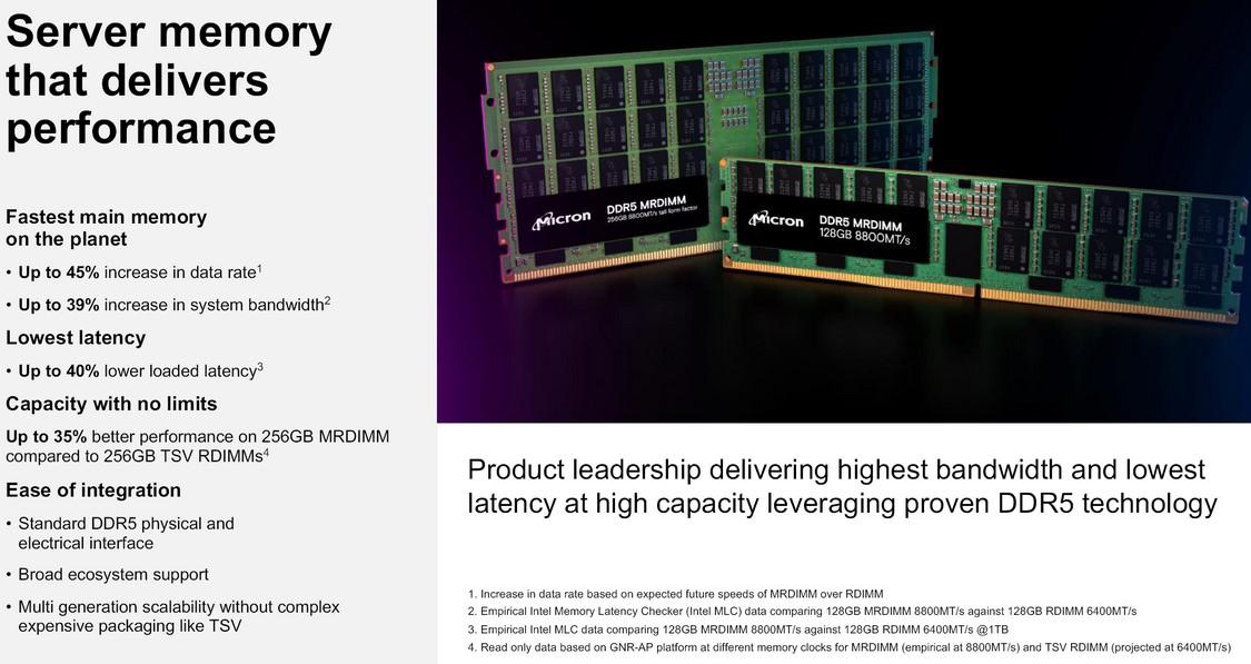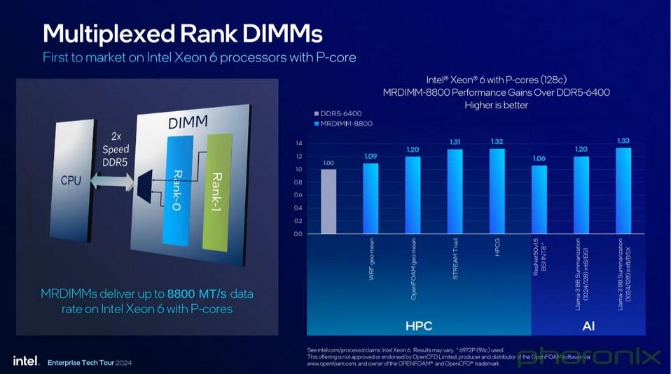 Selon Intel et Micron, un MRDIMM DDR5-8800 de 128 Go offre une latence inférieure de 40 % en charge par rapport à un RDIMM DDR5-6400 de 128 Go. La société dirigée par Pet Gelsinger a également vanté les bénéfices d’une telle mémoire pour ses Xeon 6.