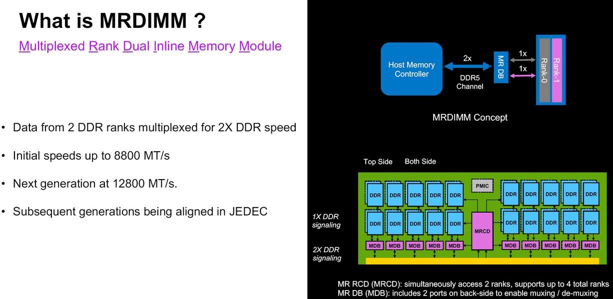 Pour décupler les performances de ses processeurs Xeon 6 lancés en juin dernier, Intel vient refaire la promotion de la mémoire MRDIMM (Multiplexed Rank Dual Inline Memory Module) ; et puisque nous n’en avons jamais parlé jusqu’à présent, c’est l’occasion de nous rattraper avec une brève présentation. Comme l'appellation l'explicite, ce sont des RDIMM affublés d’un système de multiplexage (deux rangs de mémoire DDR en mode multiplexé) dans le but d'améliorer les performances. Une puce MRCD permet l'accès simultané aux deux rangs de mémoire, tandis que des puces MDB gèrent le multiplexage.