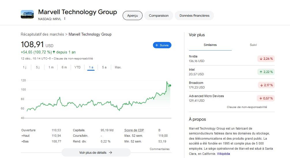 Nous verrons, mais financièrement, l’entreprise a le vent en poupe. En témoigne le cours de son action, passé d’une soixante de dollars en décembre 2023 à 111,36 dollars actuellement.