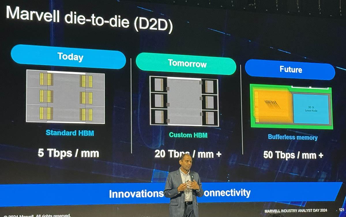 Une autre diapositive évoque une bande passante die-to-die de 20 Tbits/mm (environ 2,5 To /s par mm) pour la CHBM, contre 5 pour la HBM standard (environ 625 Go/s). À terme, Marvell table sur 50 Tbits/mm (soit 6,25 To/s par mm).