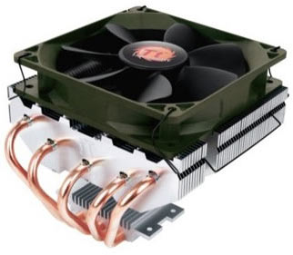 Les dimensions sont de 148 mm de longueur, 130 mm de largeur et 105 mm de hauteur ventilateur inclus. Il est compatible avec tous les sockets AMD depuis l'AM2, et idem chez Intel depuis le LGA775, ce qui inclut également le LGA2011. Pour autant ce modèle vient donc d'être lancé officiellement bien que Thermaltake le présentait sur son site depuis une paire de mois. Pour d'autres vues, c'est là-bas que ça se passe, mais vous n'aurez pas loupé le magnifique cadre vert militaire du ventilateur version "je dégueule de la bile". Les coups et les douleurs, comme on dit.....