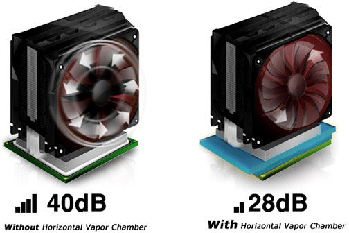 Quel intérêt pour cette solution ? D'après Cooler Master, malgré l'IHS des processeurs chargé de répartir la chaleur en surface du CPU, celui-ci présenterait des différences assez notables de chauffe d'un point à un autre. Du coup, les caloducs d'un radiateur classique ne seraient pas tous exploités de manière égale ce qui limiterait finalement la performance globale du ventirad. Avec sa chambre à vapeur horizontale, Cooler Master estime pouvoir répartir vraiment équitablement la chaleur à dissiper sur l'ensemble des caloducs.