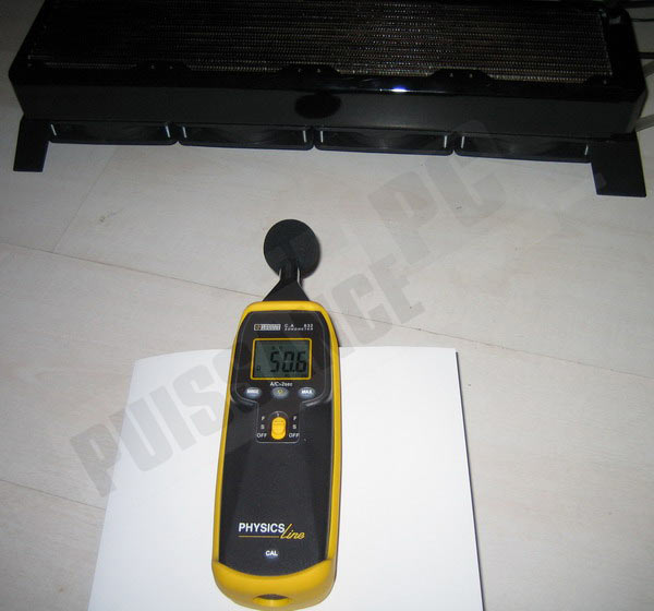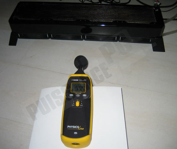 Passons à la mesure avec nos ventilateurs en 5v, dans un premier temps 4 ventilateurs. On mesure 50,6db soit une augmentation sensible mais raisonnable, c'est d'ailleurs exactement ce que l'on ressent avec le radiateur sous le bureau. On entend un -très- léger bruit de "souffle", mais ce dernier n'est en aucun cas désagréable, on arrive facilement à l'oublier lors d'une séance de surf par exemple.