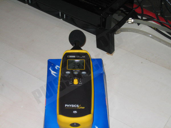 Pour mesurer ces dernières, nous avons opté pour un sonomètre installé à 5cm du radiateur et légèrement surélevé par rapport au sol. Commençons par mesurer le bruit ambiant c'est à dire configuration arrêtée et sans autres sources sonores significatives dans la pièce. 39,1db, c'est donc notre valeur de référence.