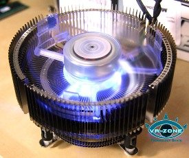 Reprenant un design en "corolle" proche des Zalman CNPS de la série "7", le radiateur est surmonté d'un ventilateur translucide à LEDs bleues donnant un certain cachet à l'ensemble, qui laisse présager de bien meilleures performances que les radboxs existant actuellement. Mieux encore un petit interrupteur sur le côté du radiateur permettra de choisir entre deux vitesses de fonctionnement pour répondre à vos désirs d'overclocking ou de silence.