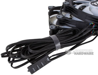 En apparence, ce sont bien des Pure Plus 14 RGB TT Premium Edition. Mais alors qu'est-ce qui change ? Les DEL adressables ? Non, elles restent au nombre de 9 sur ces modèles. Le câblage ? Pas vraiment ! On garde le bon 90 cm de câble par ventilateur. Cependant, Thermaltake abandonne sa connectique propriétaire au profit d'un second connecteur PWM. On trouve donc sur les Pure 14 aRGB Sync un connecteur 4pins pour l'alimentation et un connecteur aRGB pour la gestion de la couleur, soit 1,8 mètres de câble gainé par ventilateur !