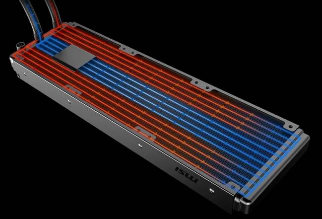 La marque insiste sur le fait que ce AIO pourra mieux résister aux flexions grâce à un tubing doté de trois couches avec maille renforcée (mouais). On ne connait pas encore la base du kit utilisé, mais on peut exclure directement l'OEM Asetek - MSI aura donc tenté de contourner les brevets - puisque ce watercooling n'a pas de pompe dans le waterblock. Cela rappelle ce qu'avait pu faire Raijintek en 2019 avec son EOS 360 RBW, qui proposait le même genre de prestations.