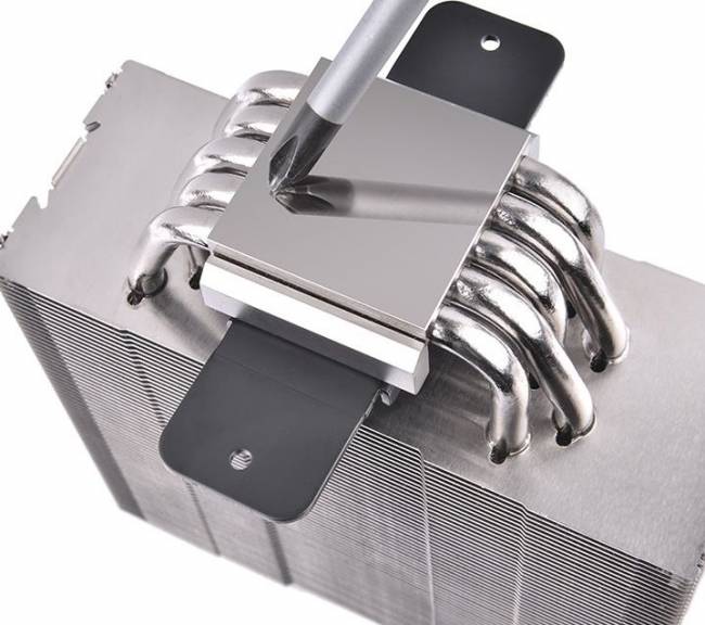 Nous sommes en face d'un produit doté de 5 caloducs de 6 mm de diamètre, avec une surface de contact en cuivre nickelé. Bien entendu, on retrouve une bonne quantité d'ailettes, dans un format simple tour, surplombé d'un moulin 120 mm à roulement hydraulique. Ce ventilateur peut accélérer jusqu'à 2000 tr/m pour un débit d'air de 72,3 CFM, une pression statique de 2,31 mm H2O et des nuisances sonores annoncées à 34,3 dBA. La durée de vie du moulin est annoncée à 30 000 heures de fonctionnement. Les dimensions de l'engin sont de 136 mm x 74 mm x 153 mm (LxPxH), il passera donc un peu partout, du moment que vous n'avez pas un boîtier ultra compact. Sinon, vous aurez aussi le droit à un éclairage ARGB compatible avec la plupart des softs de contrôles, de quoi bien ambiancer votre PC à travers votre superbe paroi en verre trempé.