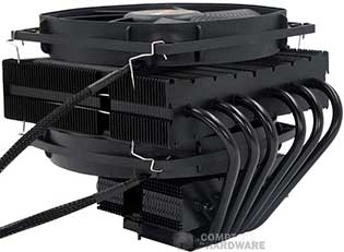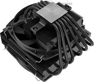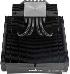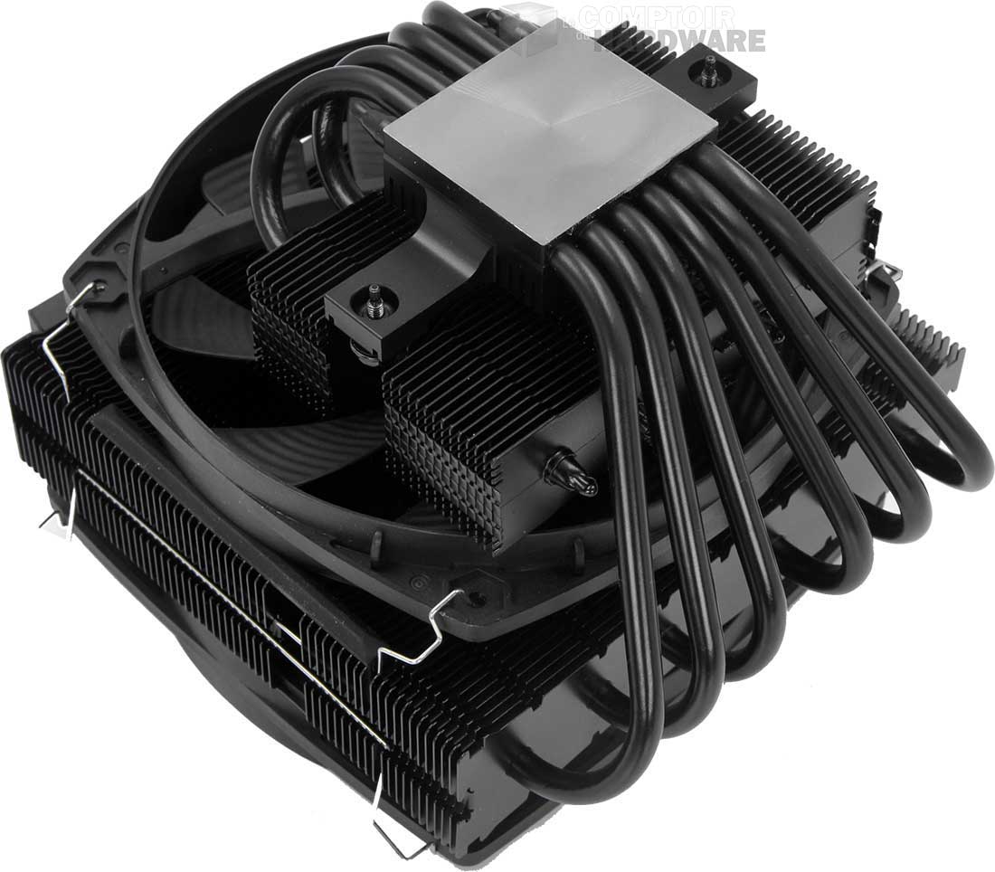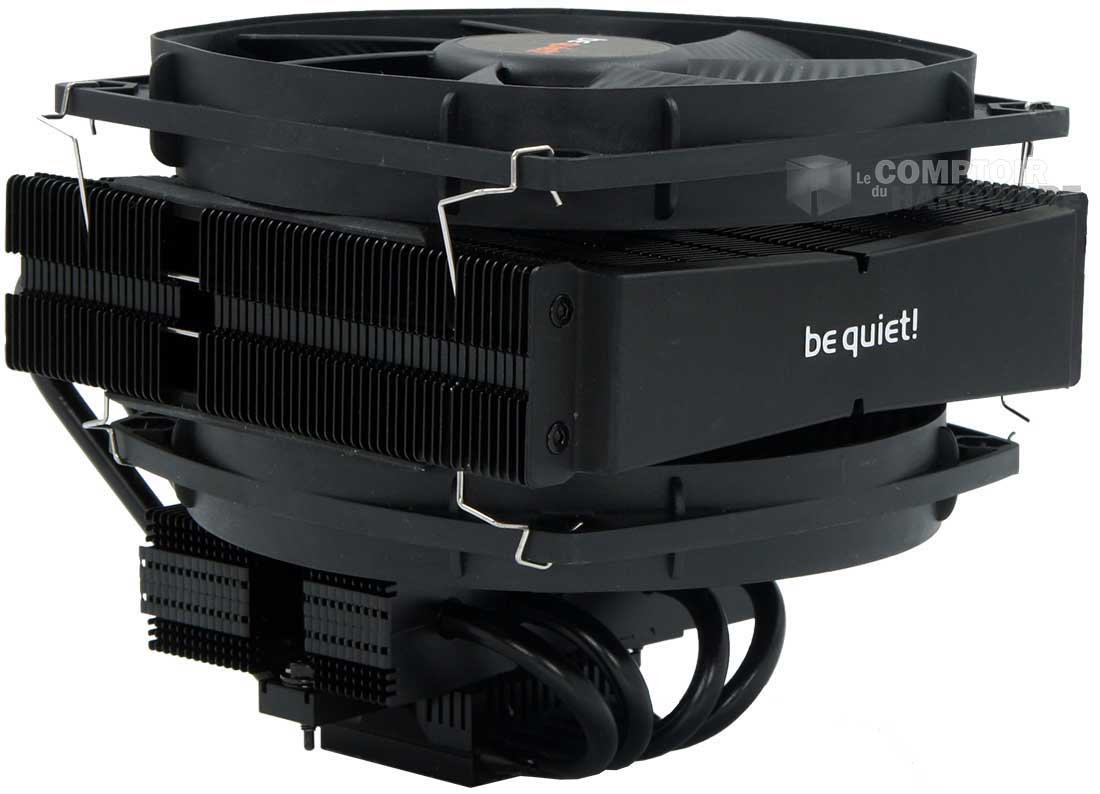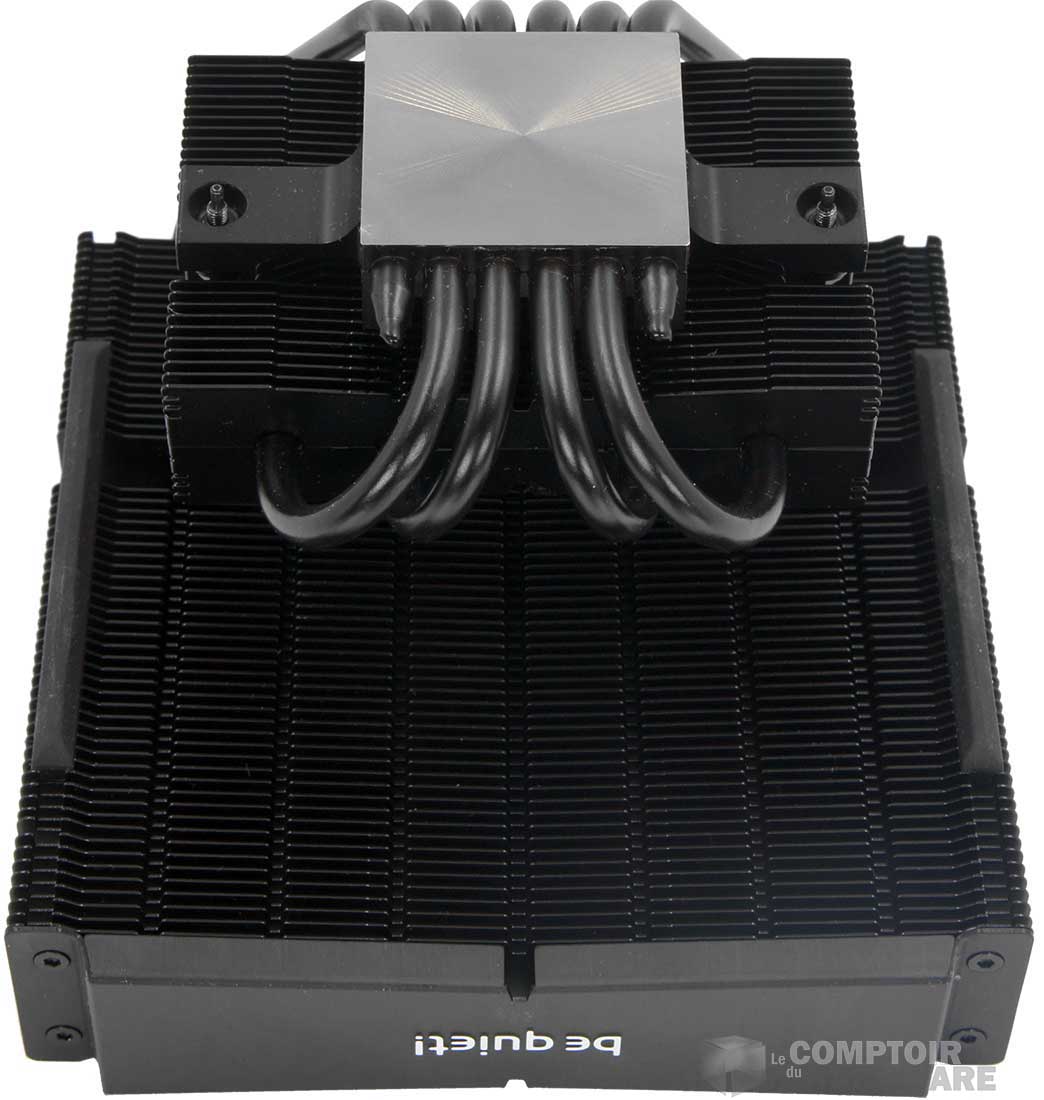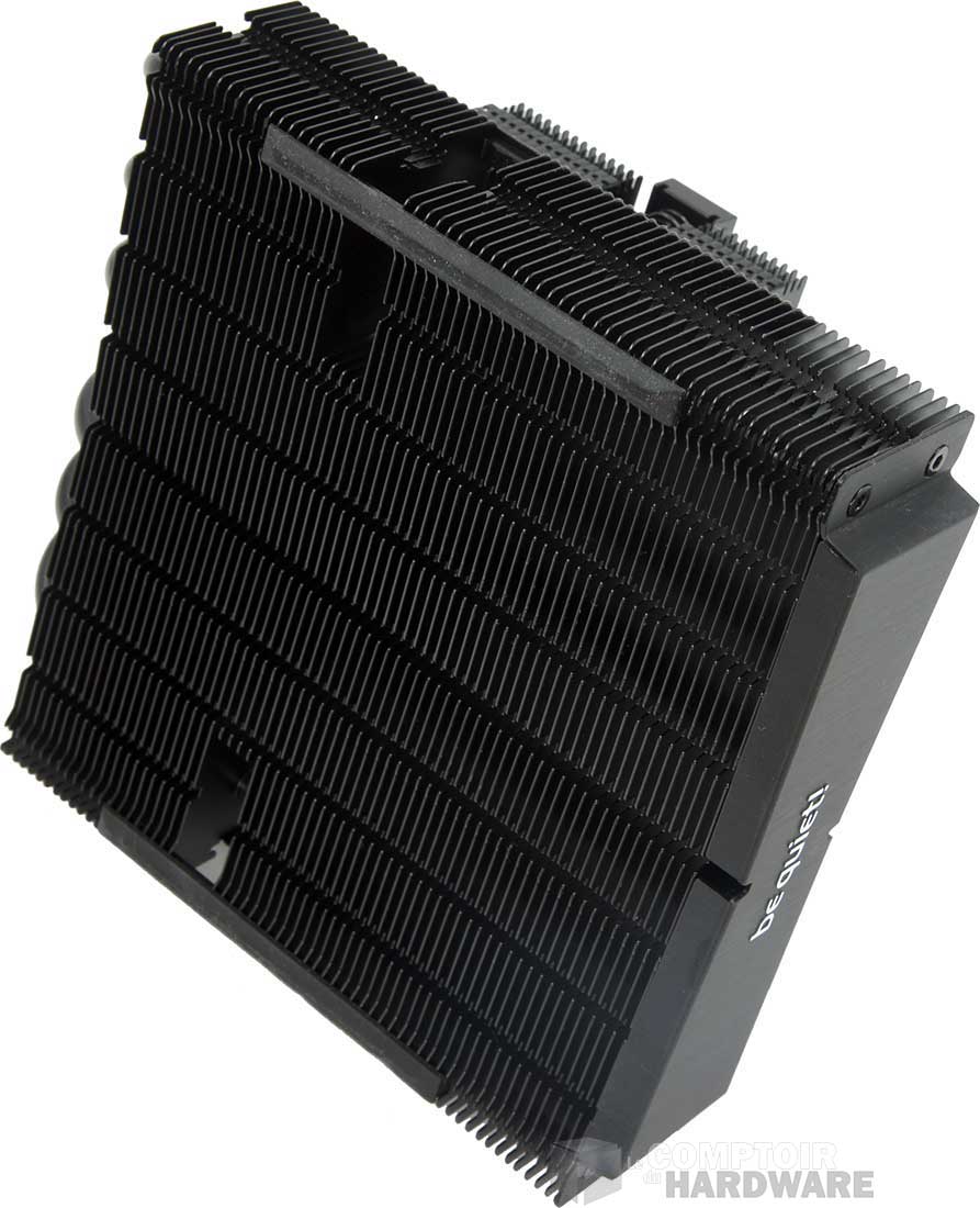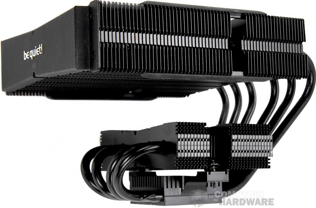 La surface de dissipation est coupée en deux, avec un radiateur de 140 sur le haut, composé de 62 ailettes en aluminium plus larges sur les bords qu'en leur centre. Jusque là rien de nouveau. Six caloducs de 6 mm courent au travers et partent vers la base. Quatre d'entre eux traversent celle-ci et se retournent vers un petit radiateur d'une trentaine d'ailettes, reprenant le design du plus grand. Sur cette version haut de gamme, be quiet! ne se tourne pas vers le HDT et conserve une base pleine en cuivre nickelé.