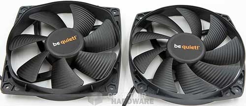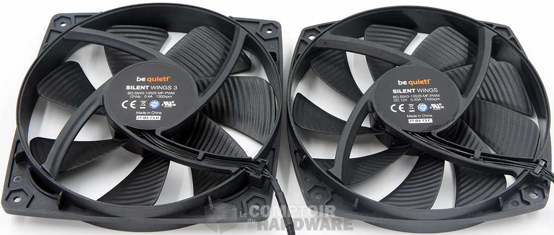 La soufflerie en charge de dissiper les calories se compose d'un Silent Wings 3 de 135 mm et d'un Silent Wings de 135 mm également. Leur look diffère légèrement comme vous pouvez le voir et le Silent Wings central ne fait "que" 22 mm d'épaisseur. La vitesse de rotation n'est pas non plus identique, le Silent Wings 3 tournera à 1300 tr/min maxi, tandis que l'autre grimpera à 1400 tr/min.