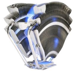 Thermaltake a en effet annoncé le lancement du V14AX, un ventirad CPU destiné aux processeurs AMD (socket AM2/AM2+) et Intel (socket LGA 775 et 1366). Il est composé de 6 caloducs chargés de transmettre la chaleur aux 98 ailettes en aluminium réparties en deux blocs. Au milieu des deux blocs d'ailettes, un ventilateur de 140mm sera chargé de refroidir le tout. Ce dernier est équipé d'une LED bleue et fonctionne entre 1000 et 1600tpm pour des nuisances sonores comprises entre 16 et 24 dB(A). Le V14AX mesure 171 x 100 x 161 mm pour un poids de 631g. Le V14 AX devrait être disponible très rapidement.