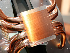 Ceux qui suivent de près l'évolution des ventirads n'auront pas manqué de remarquer que si la technologie "Heatpipes Direct Touch" (en bon François "à caloducs exposés") a des avantages certains en permettant à la chaleur de passer directement du CPU aux caloducs, sans avoir à traverser une base de radiateur en cuivre, elle a également des inconvénients. L'un des plus souvent cités est l'état de surface de la base du ventirad, car les caloducs ont beau être serrés les uns par rapport aux autres et écrasés, il demeure des interstices assez marqués, comme par exemple sur le Vendetta 2 d'OCZ. Coolink présentait pourtant un ventirad Direct Touch ne semblant pas souffrir de ce problème lors du Computex. A sa base on retrouve bien 4 caloducs "écrasés", le nombre classique actuel pour les ventirads de ce type, mais la firme a inséré tout de même une très fine épaisseur de cuivre afin d'homogénéiser la surface en contact avec le heatspreader du processeur. On pourrait dès lors dire qu'il ne s'agit plus vraiment de caloducs exposés, mais le résultat reste à peu près équivalent, rien à voir en tout cas avec une base "normale", laissant généralement au moins 2mm d'épaisseur de cuivre à traverser avant d'atteindre les caloducs. Nous avons plutôt là affaire à quelques dixièmes de mm seulement ! Il reste à attendre des tests, coup de maître ou coup dans l'eau, les paris sont ouverts. (Source TechPowerUp)