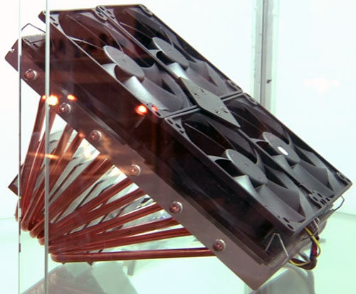 12 caloducs de 6mm de diamètre qui traversent base et ailettes de toutes parts, 4 ventilateurs Kaze-Jyu de 100mm sur le dessus, un modèle de folie qui restera certainement lui aussi un prototype tant on l'imagine mal dans une configuration. Et pourtant... que ne donneraient pas certains amateurs de sensations fortes pour pouvoir faire mumuse avec un tel monstre sur leur table de bench par exemple ? Nous verrons bien si Scythe tente cette fois-ci une commercialisation. (Source Overclockers.at)