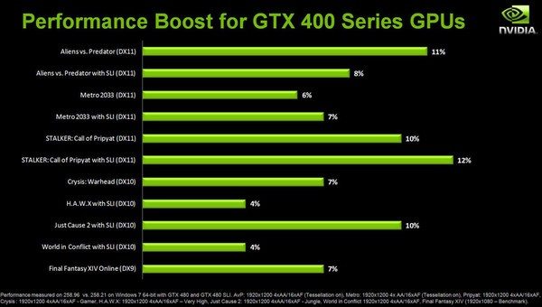 Et Nvidia ne tarit pas d'éloge au sujet de ces 258.96, annonçant des gains de performances intéressants sous une multitude de jeux. Pour joindre le geste à la parole, le caméléon a d'ailleurs mis en ligne un graphe regroupant les gains qu'ils ont enregistrés avec une GTX 480 (ou deux en SLI d'ailleurs), et ce en 1920*1080, généralement en AA4X / Aniso 16X :