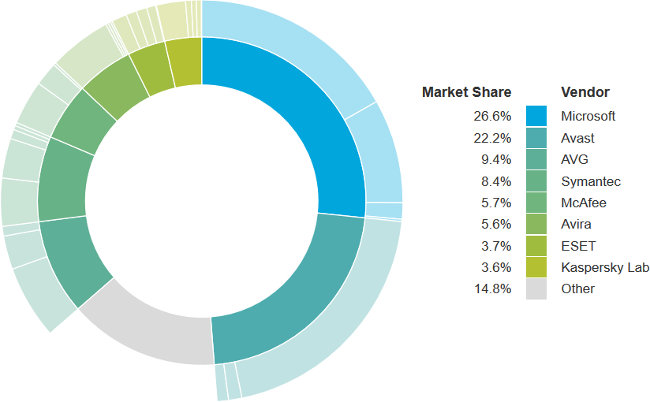 Un bon gros camembert est toujours un bon moyen de montrer la tendance. Si vous vous rendez sur la page dédiée à l'étude, vous pourrez en voir une version interactive vous présentant les parts de représentation de chaque logiciel pour chaque firme. Sur le podium on retrouve en première place Microsoft, avec 26,6% de représentation dont 62,9% se fait grâce à Microsoft Security Essential (MSE pour les intimes), 31,4% par Windows Defender, 4,9% par System Center Endpoint Protection et 0,7% par divers autres produits de leur cru. En seconde place on a Avast, avec 22,2%, 91% de sa représentation étant due à la version gratuite de son logiciel, ne laissant que 9% de personnes payant pour leurs services. En troisième, mais assez éloigné avec 9,4% on retrouve AVG qui lui aussi est majoritairement présent grâce à la version gratuite de son soft (63% de représentation).