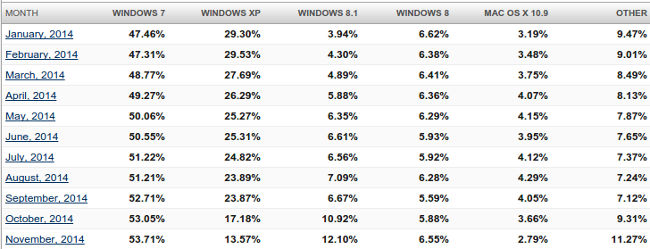 Si l'on voit bien que l'été 2014 a été l'amorce de la chute de Windows XP, on peut aussi voir qu'il aura fallu attendre octobre pour qu'un vrai changement s'opère, merci la rentrée des classes. Windows 7 gagne plus de 6% de représentation sur l'année, Windows XP perd pas loin de 16%, Windows 8.1 gagne plus de 8%, Windows 8 stagne dans son coin, OS X 10.9 baisse sur la fin d'année et les "Autres" grimpent en flèche. On voit déjà des fans du manchot se préparer à ragoter que la révolution est en marche, mais ça n'est malheureusement pas le cas. Juste que OS X 10.10 est arrivé et qu'il n'est pas encore représenté dans les OS majoritaires du tableau, le gros pourcent manquant se trouvant en fait là.