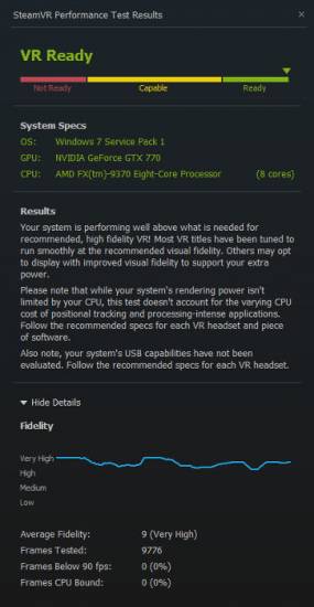 On vous a sorti un tas de captures d'écran sur des machines diverses et variées. La plupart des configurations sont overclockées et réglées aux petits oignons, ce qui joue forcément sur les résultats. Mais globalement, les annonces de Valve sont respectées (CPU : Intel Core i5-4590 / AMD FX 8350 et GPU : NVIDIA GTX 970 / AMD Radeon R9 290) avec possibilité de tenter l'expérience avec du matériel légèrement plus ancien. On voit des GTX 770 et HD7950 s'en sortir et des processeurs un peu plus légers (Core i5-2500K, FX-8120) tenir la cadence. Du coup, pour celui qui ne visent pas le réglage Ultra, mais qui espèrent pouvoir porter un de ces casques à l'occasion (on ne sait jamais, tout le monde peut voir 700€ tomber du ciel), une machine à base de FX-8120 et R9 280 permettra de commencer à y penser (certains jeux ne seront cependant pas accessibles, car configurés pour uniquement fonctionner avec les machines offrant la meilleure expérience). On est déjà sur de la bonne bête à 800/900€, mais loin de la machine d'ultraRoXoR à 2000 boules !