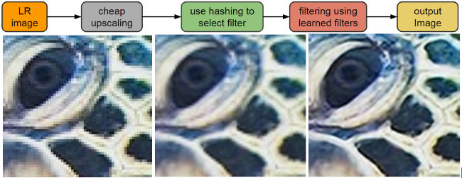 Les techniques d'agrandissement d'image existent déjà (on parle d'Upsampling dans ce milieu), mais se servent généralement des pixels présents sur l'image en les copiant pour reconstruire les endroits manquants, ce qui est de l'interpolation et parlera à ceux qui aiment avoir beaucoup de FPS en jeu. Sur l'image présentée précédemment, vous avez l'original à gauche, un agrandissement par deux au centre et à droite la solution de Google. Même un oeil peu averti saura faire la différence et l'option de Google va plus loin en permettant la chose beaucoup plus rapidement et sur du matériel standard (comprenez votre PC ou même une bonne tablette). De plus, elle arrive à régler le problème de crénelage (aliasing) qui pose problème sur les agrandissements standards. En effet, une méthode d'amélioration linéaire de l'image va forcément reproduire une partie des défauts de cette dernière, avec RAISR, l'image en basse définition servant de base pour que la machine devine ce qu'il y a dans les trous, cela permet de compenser la chose et d'éviter de reproduire ce qui ne devrait pas l'être. Plus parlant que des mots, voici une image présentant la chose :