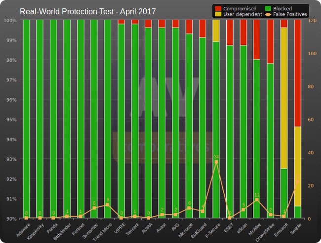 Pour ce troisième test de 2017, on aura le droit à l'analyse des suites suivantes : Adaware Pro Security 12.0, Avast Free Antivirus 17.3, AVG Free Antivirus 17.3, AVIRA Antivirus Pro 15.0, Bitdefender Internet Security 2017, BullGuard Internet Security 17.0, CrowdStrike Falcon Prevent 2.28, Emsisoft Anti-Malware 2017, eScan Corporate 360 14.0, ESET Internet Security 10.0, F-Secure Safe 2017, Fortinet FortiClient 5.4, Kaspersky Internet Security 2017, McAfee Internet Security 19.1, Microsoft Security Essentials 4.10, Panda Free Antivirus 18.0, Seqrite Endpoint Security 17.0, Tencent PC Manager 12.3, Symantec Norton Security 22.9, Trend Micro Internet Security 11.1 et VIPRE Internet Security Pro 9.3. On a donc du gratuit (Avast, AVG, Panda), Microsoft pour donner le la et la même bande que le mois précédent.