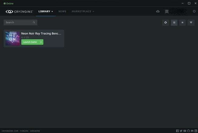 Toujours est-il que cette démo, qui est un benchmark RT sous moteur CryENGINE, est désormais téléchargeable sur le site de Crytel. Il faudra, pour la lancer, télécharger l'installeur du client CryENGINE, ce dernier ensuite téléchargera la version 5.6.4 du moteur. Par la suite, vous devrez créer un compte et choper sur le marketplace la démo gratuitement. Vous aurez le choix de la définition, ainsi que celui de la qualité du RT, Ultra ou très élevé. Le reste des options est inaccessible, et c'est tant mieux puisque ça facilitera les comparaisons directes d'une machine à une autre.