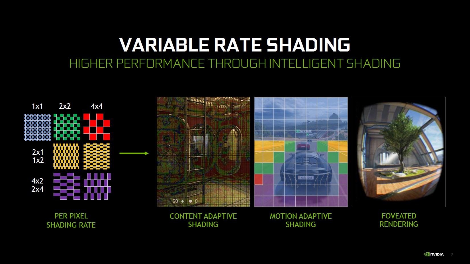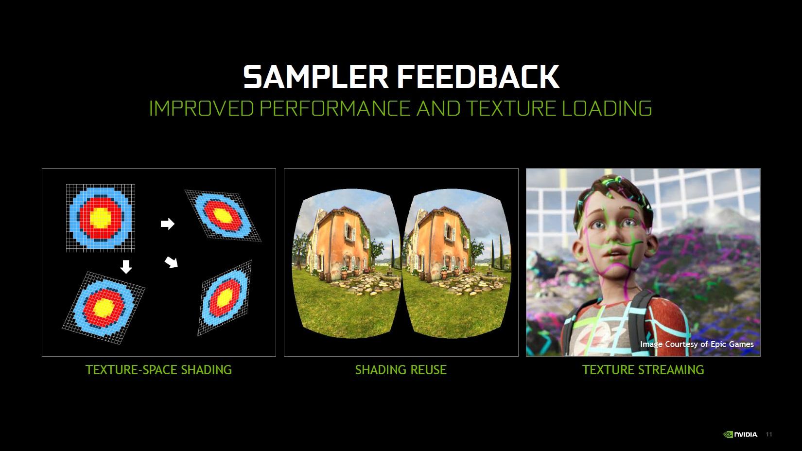 Quèscaco ? C'est une nouvelle API mais pas vraiment nouvelle, en fait ! Il s'agit toujours de DX12, mais dans sa version mise à jour. Microsoft avait déjà communiqué sur le sujet ici, ce dont nous vous parlions là. En mode résumé, DXR passe au Tier 1.1, le Variable Rate Shading est directement implémenté dans l'API, tout comme les Mesh Shader et Sampler Feedback. Toutes ces fonctionnalités ne doivent pas vous être inconnues si vous nous lisez régulièrement, puisque nous les avons pour la plupart détaillées lors de notre dossier destiné à l'architecture Turing. Vous trouverez ci-dessous quelques slides des verts rappelant brièvement leur usage.