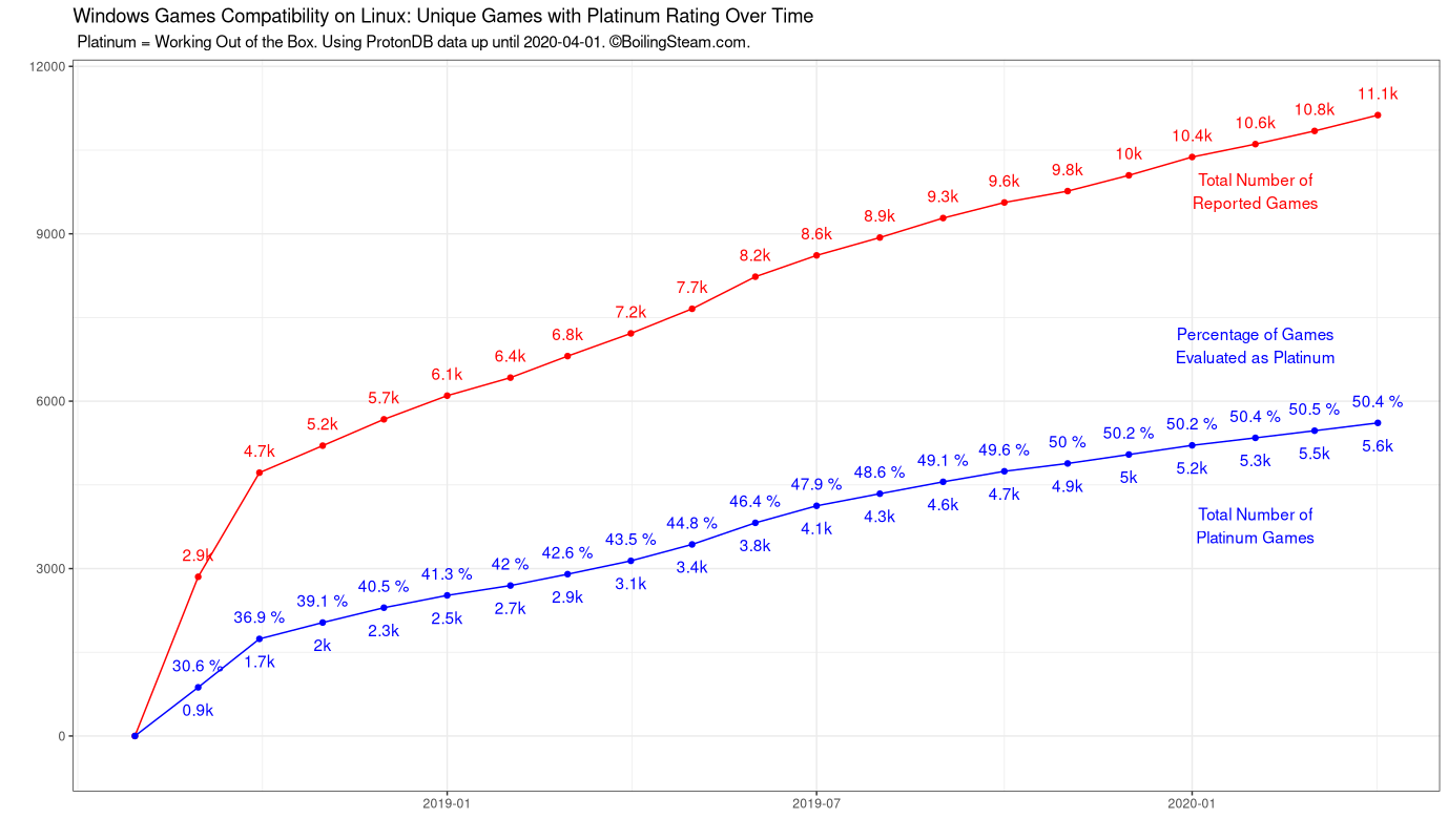Ainsi, depuis le lancement, ce sont pas moins de 11 000 jeux différents qui ont été testés par la communauté, avec une augmentation assez constante de 300 nouveaux par mois. Pour les titres totalement fonctionnels, le rythme est inévitablement réduit, mais ces derniers représentent tout de même 50,4 % du panel testé, soit près de 6 000, avec une augmentation, ici aussi constante, d’environ 100 jeux par mois. Rappelons que tout cela a été réalisé en deux ans seulement, autant dire que Valve n’a pas chômé, même si les fondations posées par Wine ont dû également être bien utiles ! Qu’est-ce que le géant distributeur de jeux vidéos nous réservera à partir de ce projet ? Mystère, le comptoir est sur le coup ! (Source : BoilingSteam)