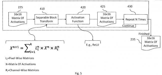 Au menu : dans un bousin intégrant un CPU, un GPU et de la RAM, un réseau de neurones serait intégré dans un jeu, en collaboration interne avec le moteur, permettant d’appliquer une post-passe de mise à niveau de la définition avant affichage. Le brevet va même plus en détail et propose un réseau se rapprochant d’une convolution, s’appliquant sur des blocs de taille 16x16 composés de pixels adjacents, avec la subtilité de repasser possiblement plusieurs fois dans le réseau avant de ressortir traitée. Si vous suivez, vous noterez l’absence de données temporelles dans le schmilblick, le mettant ainsi en concurrence avec le DLSS dans sa première itération et le FSR de chez AMD.