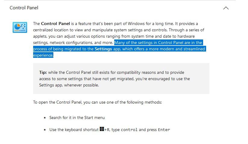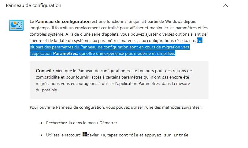 Depuis, l’entreprise a changé son fusil d’épaule. Si vous accédez à la page susmentionnée, vous ne lirez pas ce qui précède, mais plutôt ceci : « La plupart des paramètres du Panneau de configuration sont en cours de migration vers l’application Paramètres, qui offre une expérience plus moderne et simplifiée ». Le conseil n’a pas changé en revanche.
