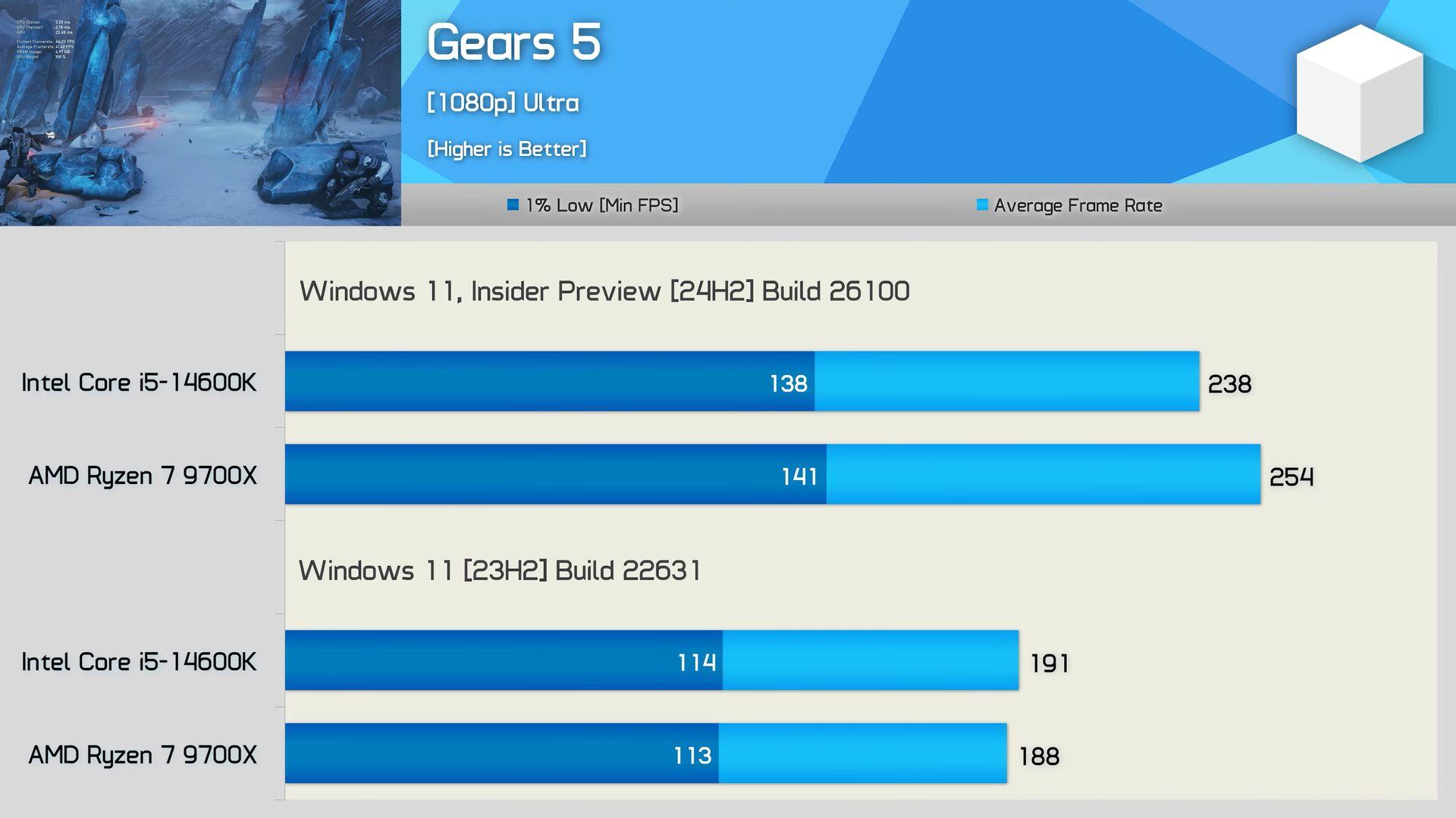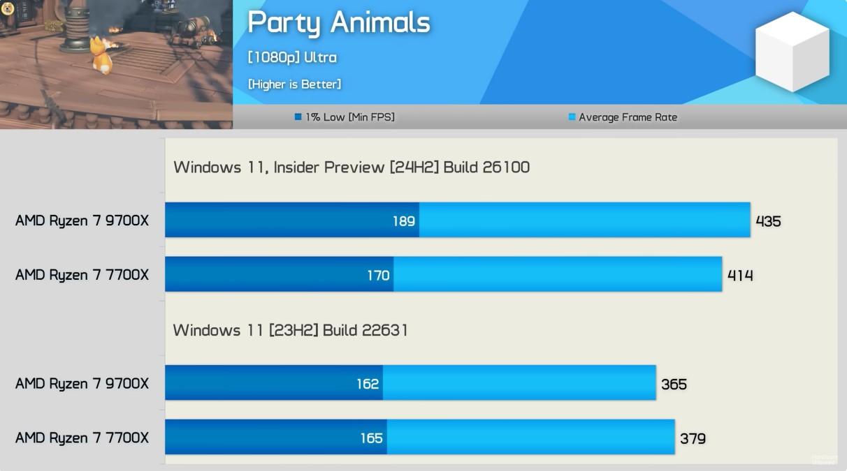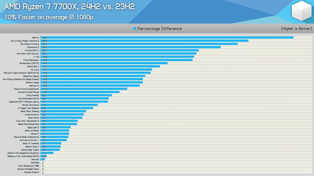 HardwareUnboxed et KitGuruTech ont donc testé la mise à jour 24H2 de Windows 11 avec différents processeurs, y compris des puces Intel. Selon les mesures de HardwareUnboxed, dans l'ensemble, la version 24H2 montre une amélioration moyenne de 10 % sur 40 jeux en 1080p pour le 7700X, et de 11 % pour le Ryzen 7 9700X. Sauf erreur de notre part, le GPU mis à contribution n’est pas précisé, mais nous suspectons une GeForce RTX 4090 comme de coutume.
