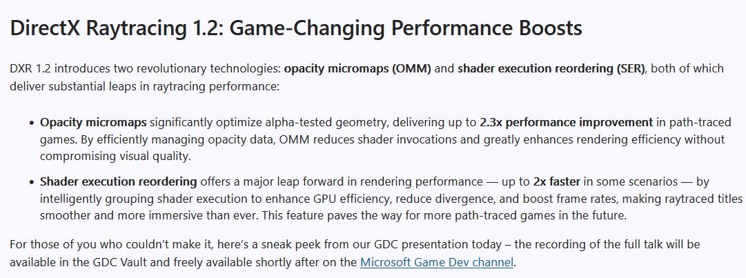 À ce stade, Microsoft se limite à clamer que « DXR 1.2 introduit deux technologies révolutionnaires » : les OMM (opacity micromaps) et le SER (shader execution reordering). Les premières portent sur la géométrie, et doivent contribuer à octroyer « jusqu’à 2,3 fois plus de performances dans les jeux impliquant du path tracing ». Le second intervient, comme son nom l’indique, dans l’exécution des shaders. En amélioration l'efficacité, il « offre une avancée majeure en termes de performances de rendu — jusqu'à deux fois plus rapide dans certains scénarios ».