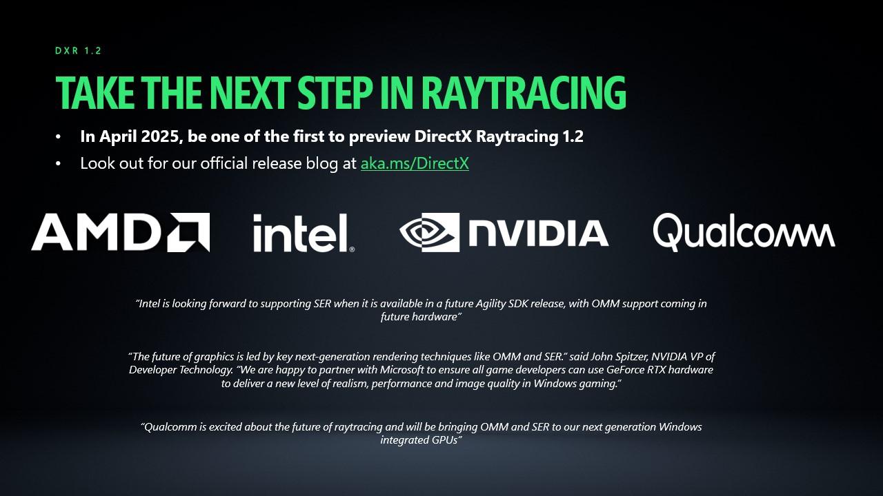 Bref, les GPU NVIDIA RTX supportent déjà ces deux fonctionnalités. C'est le cas de toutes les générations pour l’OMM ; au moins à partir des RTX 40 Series pour le SER (nous n'avons toutefois pu déterminer si c'était, ici aussi, juste une histoire d'optimisation, ou un véritable prérequis). C’est sans doute la raison pour laquelle Microsoft écrit dans son communiqué que « NVIDIA s'est engagée à une prise en charge via les pilotes des GPU GeForce RTX » ; qu’elle collabore avec AMD, Intel et Qualcomm, pour « garantir une adoption généralisée ».