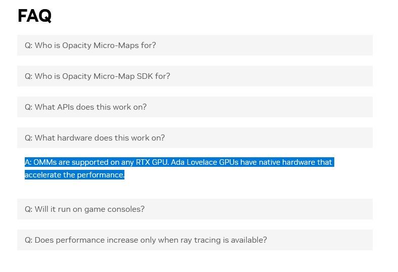 Même constat pour l'OMM, comme en témoigne la diapositive ci-dessous. Sur la page du SDK, il est même stipulé que « les OMM sont pris en charge sur n'importe quel GPU RTX. Les GPU Ada Lovelace disposent d'un matériel spécifique qui accélère les performances ». La FAQ confirme cette distinction.