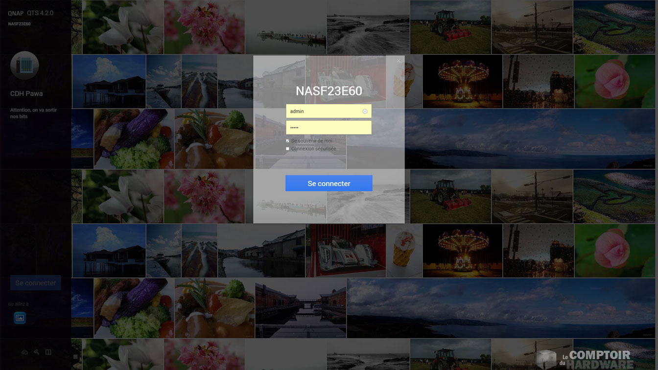 Une fois les paramètres appliqués, nous arrivons sur la page de connexion de QTS 4.2. Plusieurs informations sont disponibles ici comme la version du firmware, un petit message d'accueil personnalisable et un bouton d'accès direct à Photo Station. Dans l'encart de connexion, il suffit de renseigner le nom du compte et le mot de passe associé pour accéder au bureau.