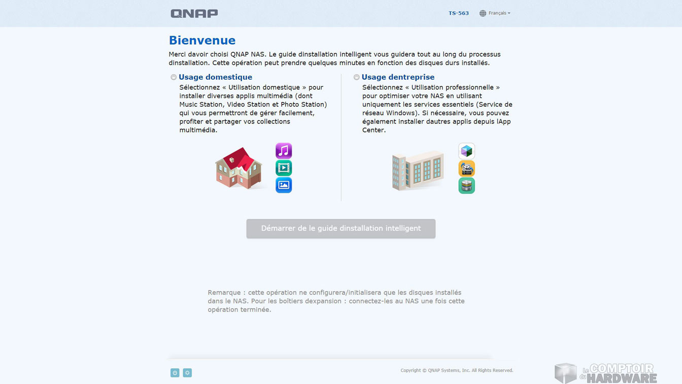 Le TS-563 se décline en deux versions comme nous l'avons déjà dit. La version 2Go sera facturée 610€, alors que la version 8Go elle culmine à 754€ précisément et se retrouve moins pertinente, mais ça on vous l'expliquera à la fin. Il est temps de passer à l'initialisation du NAS.