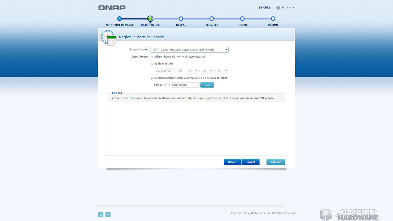 Nom du NAS, compte administrateur et mot de passe sont à renseigner sur cette première page; rien de sorcier jusque là. La seconde phase est toute aussi simple avec le choix du fuseau horaire et/ou le réglage manuel ou selon l'heure locale de votre NAS.