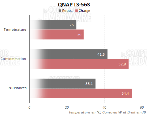 Quant à la consommation, elle est sans doute le point noir du TS-563. La consommation au repos est bien plus élevée qu'à l'accoutumée sur ce modèle puisqu'on enregistre 41.5W à la prise. En pleine bourre, celle-ci grimpera jusqu'à 52.8W. On a vu mieux chez les concurrents, sauf l'Asustor.