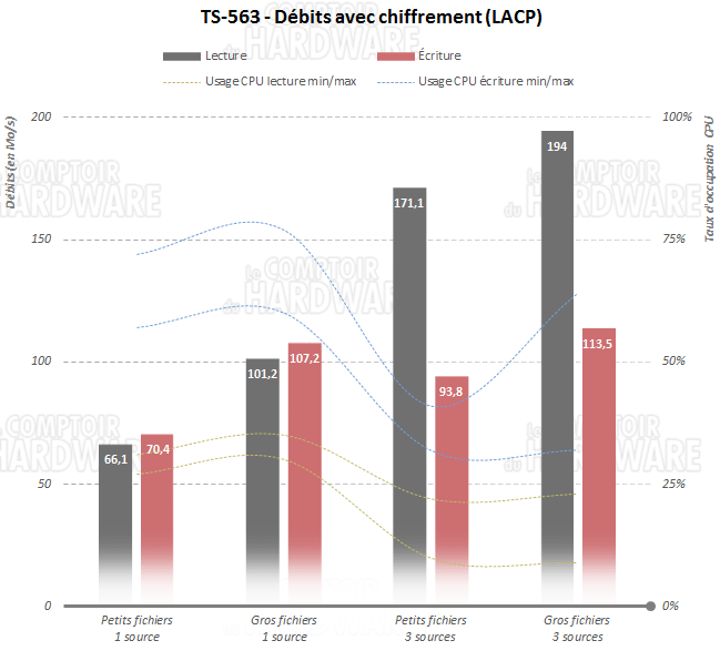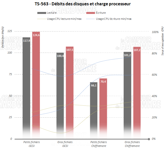 Nous avions souligné plus haut les performances du chiffrement matériel sur ce modèle. Ainsi paramétré, le TS-563 montre une fois de plus qu'il est à l'aise. Les débits enregistrés lors du transfert de petits fichiers sont meilleurs que lorsque l'option de chiffrement n'est pas activée, dépassant les 170Mo/S en lecture. Un gain de performance est également relevé lors de la phase d'écriture, mais il est loin d'être aussi impressionnant. Sur le transfert de gros fichiers, même schéma : des débits à peine meilleurs en écriture et quasi doublés en lecture.