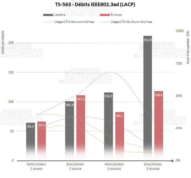 Le TS-563 est équipé de deux ports RJ45, permettant de sécuriser ses transferts via diverses associations, mais aussi de doubler la bande passante théorique. Paramétré en IEEE 802.3ad, on s'attend à du bon avec ce modèle. Voyons ce qu'il ressort de nos tests :