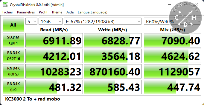 Passons rapidement dans le vif du sujet ! Sous cristaux d'amphétamines mark, avec l'utilisation de set de données incompressibles, les promesses sont tenues et les chiffres atteints sont impressionnants : on sature quasiment le lien PCIe 4x4. Le KC3000 envoie des débits qui gravitent avec les 7 Go/s et se permet même le luxe de franchir le cap des 100 Mo/s sur du random 4k, ce qui est à ce jour quelque chose encore d'assez rare.