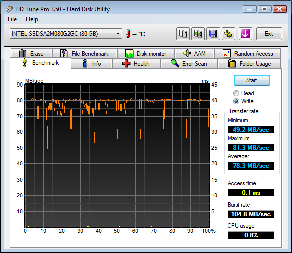 En écriture cette fois, le débit séquentiel maximum est en très légère progression par rapport à la première révision, mais toujours très loin des ténors à ce niveau ! Ceci dit, ce point est toujours peu pénalisant à l'heure actuelle vu l'usage réservé aux SSD (principalement l'OS+applis) et compte tenu de leurs tailles relativement limitées face aux HDD. Il serait bon toutefois qu'Intel améliore ce point à l'avenir. Plus important, les écritures de petits fichiers sont à nouveau dans le haut du tableau, la réactivité du système n'en sera que plus importante lors de ce genre d'opérations traditionnellement gros point faible des SDD.