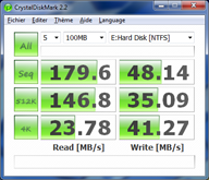 Voici les courbes de lecture et écriture obtenues à l'aide de IOMeter en fonction de la taille des fichiers manipulés. En lecture, on atteint les niveaux annoncés soit près de 170 Mo/s et ce en accès séquentiels comme aléatoire, il faut toutefois attendre les fichiers de 16 Mo pour y arriver lors de ces derniers, la courbe démarrant de bien plus bas et subit comme toujours une cassure dans la progression aux environs des fichiers de 256 Mo.